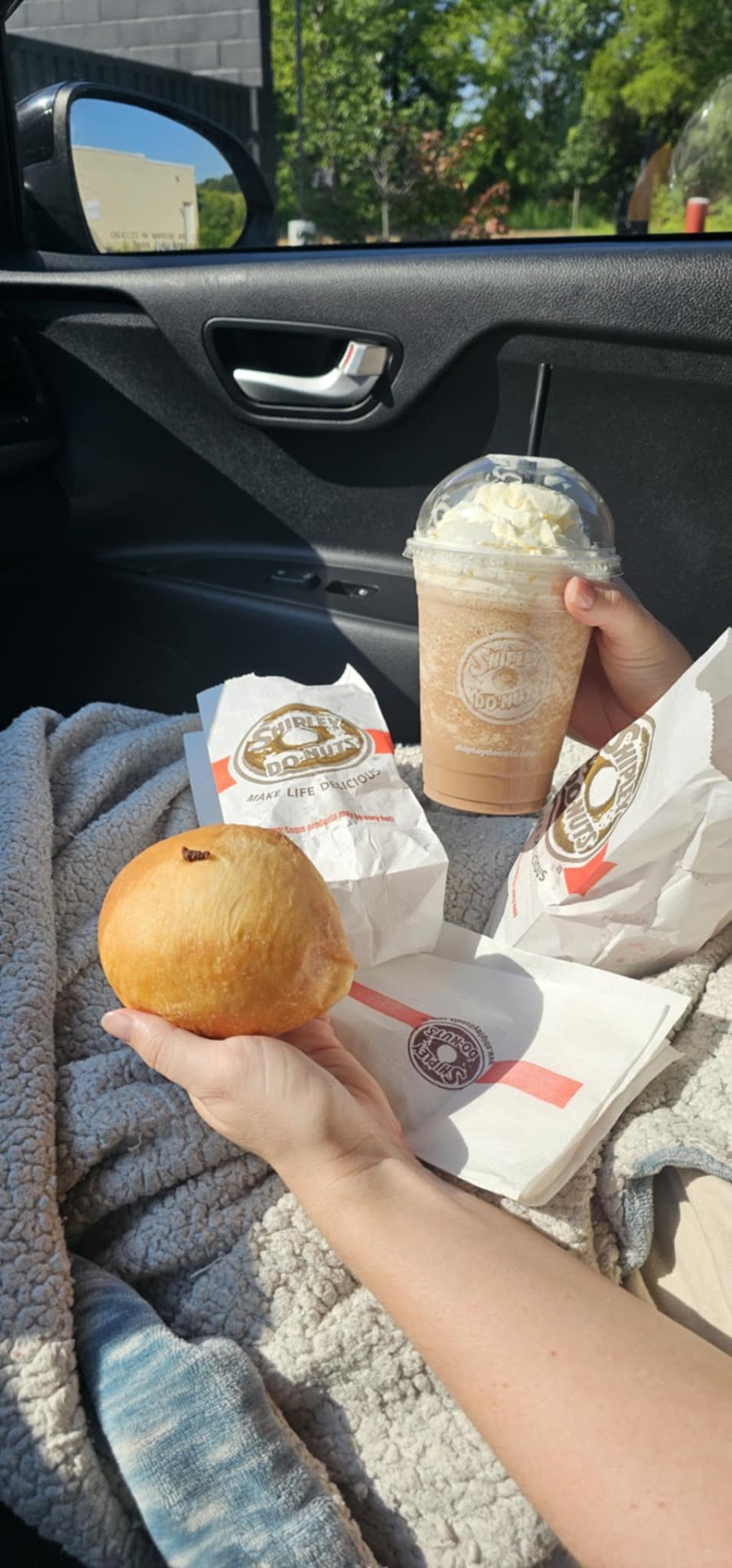 Our next trip there, I decided to go inside. I asked the cashier to please pick the fresher donuts if they could. And they said they would. I asked for some Kolaches and they said they didn't have any. Also, their drink machine wasn't working to make their specialty coffee drinks. Very disappointing. And made it worse was going home with the donuts only to find them as hard as they were on our first visit.
