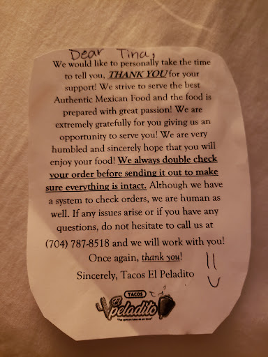 First, this food was freaking delicious! Second, the menu has tremendous home-cooked variety, which means I will never get menu boredom at this resturant. The young man who took our order, possibly the son, and the young lady who filled our order, possibly the daughter (got the impression it was a family business) took such pride in describing the menu items to us; they even gave us free samples of those amazing aqua frescas, which we slurped down with ease. Back at home, we noticed they gave us a complimentary small aqua fresca flavor that we ended up buying on our second visit in the two weeks I was in the Concord area. On both take out and delivery, our food was hot, delicious, authentic and beautifully plated, rendering me all the more happy to be eating there again! All three of us devoured our tacos and our chips, salsa and chorizo queso without hesitation. This food here is freaking awesome! I cannot wait to dine in this nicely decorated resturant when COVID allows and when I am back in N.C. They even left me this note (pictured) in my delivery bag. This family is proud of their heritage and loves to spread that joy through the innocence of sharing their culture's food with us. Thank God they do it so very well! Four weeks later and back north, I wanted to be sure to remember to write this very important resturant review for Tacos El Peladito who makes dining...