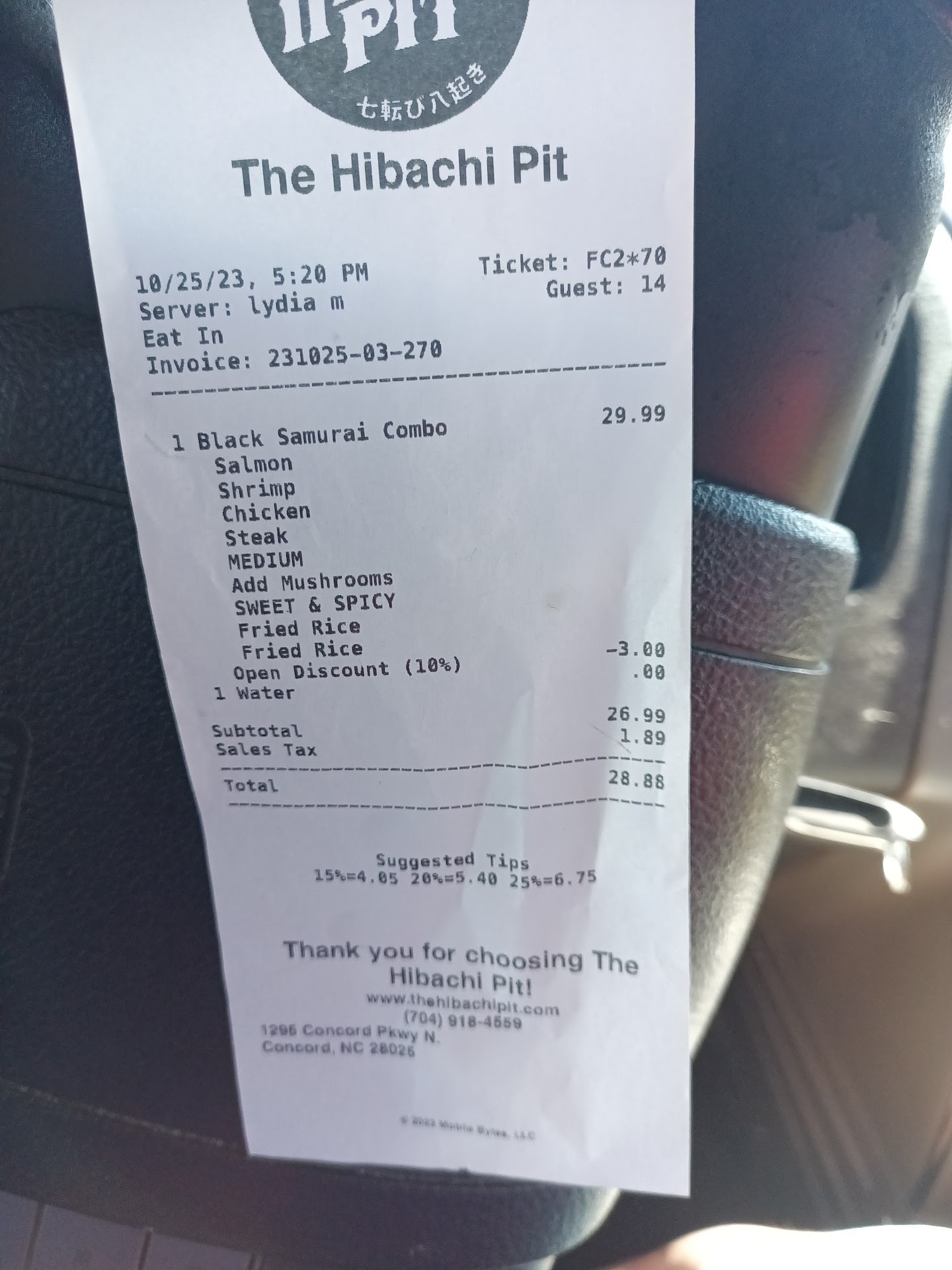 Read moreI came in yesterday and I ordered a coke zero and the black samurai. The waitress was amazing. Especially being her first day there as she says she usually works at the smoke pit in Salisbury. However it seemed as though someone had hooked a cherry coke bag to the mixing station where a coke zero was supposed to go. Because the cherry coke and coke zero tasted identical, except the "coke zero" had a tiny bit more carbonation then the actually cherry coke. So I opted for water. Would definitely recommend having Coke come out and and dial your mixing station in. The food was good. Salmon was great, shrimp was Great and so was the chicken and steak. However hibachi style fried rice no matter where you go usually has a pretty uniform flavor profile across the board which one comes to enjoy and somewhat expect. The rice here is nowhere near that flavor profile. It's actually a more acquired taste so I would recommend working on the recipe for the rice a little, to try and dial that flavor in more to a more authentic flavor. The biggest issue and I know things happen but for a 30 dollar plate I don't expect to receive hairs in it. And on something like that a meal/check should never be just discounted and pushed away like it wasn't important . The hair went into my mouth as I scooped from the bottom of my rice. And I had to pick it out. Which makes you lose your appetite naturally. No....It should be remade and comped. But I got a 3 dollar discount. Which is more of passing my concern off to someone else because you don't want to deal with it. And usually when a hair or something foreign is found in someones food a member of management usually corrects the issue and not makes their waitress do the dirty work. Just a little little food for thought. I think price range is decent for the amount of food. And I understand this is the first week opened. So there will be kinks to work out just like any restaurant. Which is why I'm trying to be as detailed as possible. I am willing to give it another shot. So I will be back. Hopefully without the...