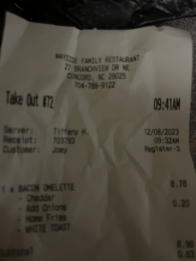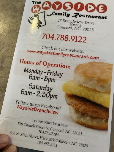 Read moreHubby and I wanted to try Wayside for a while and were able to do so today. Decor could use some sprucing up. It was as clean as a Waffle House or Cracker Barrel,which is neither a compliment or a knock....If you have eaten at these places then you know what I mean. We had breakfast and my husband enjoyed the French Toast. I had a pancake, 2 eggs and bacon. Honestly, it was not good, just mediocre, like Denny's. The coffee had no kick. I was disappointed and don't see a reason today eat breakfast here again over WH, or CB. Our sever was FANTASTIC and my husband was sure to tip her well. Everyone seemed friendly. Maybe their lunch and dinner items are better, but we probably won't come back...