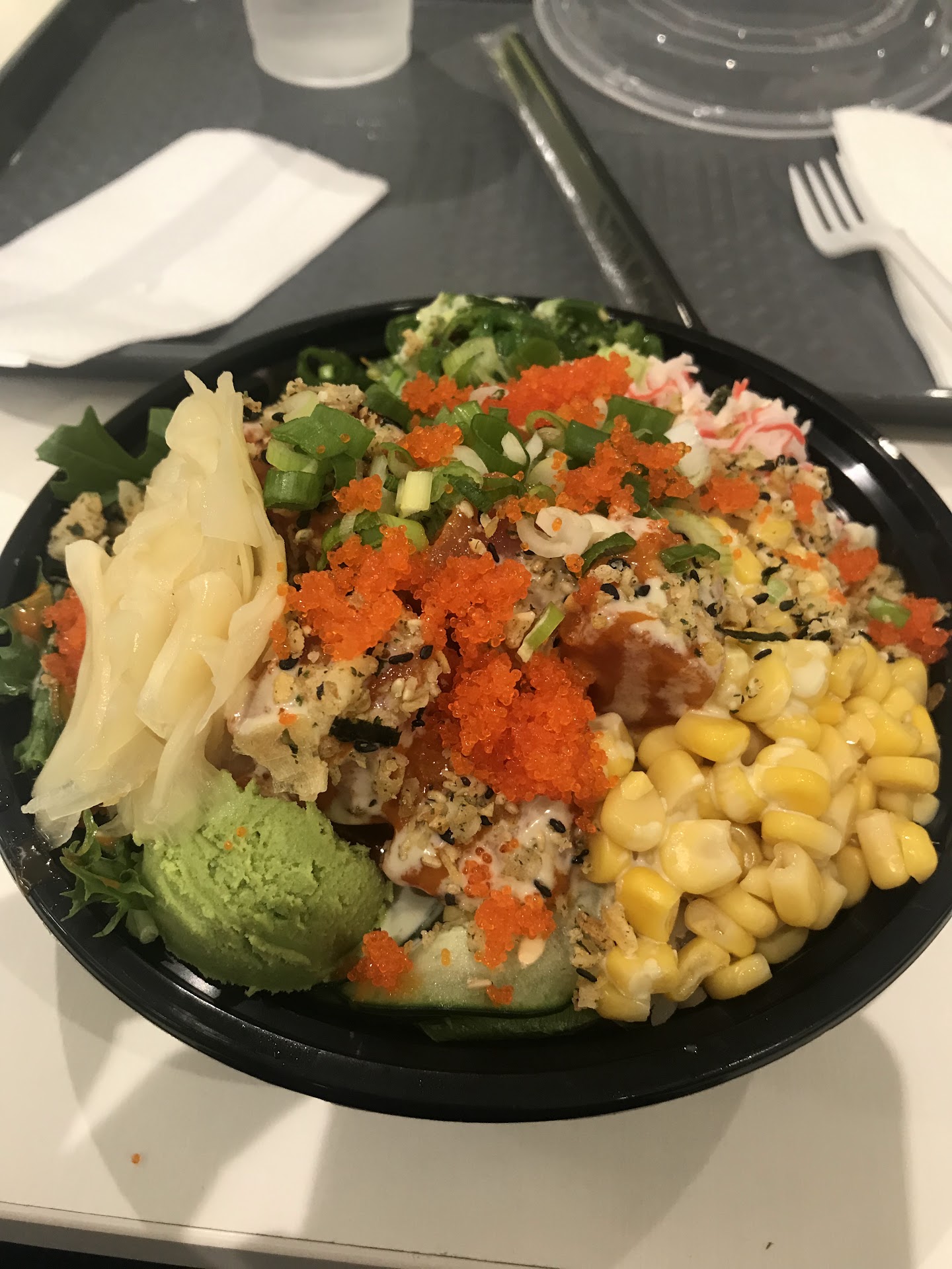 I donāt eat raw fish at all, but this place was very attractive to me when I was hungry and looking for something to eat at the food court. so I decided to give a try since their menu offers Seasoned Tofu Bowl, it is a descent size, I got seaweed which is my favorite, also cucumber crab meat and sweet corn, the seasoning of the tofu is just so amazing, they marinated with lots of sesame itās so tasty.