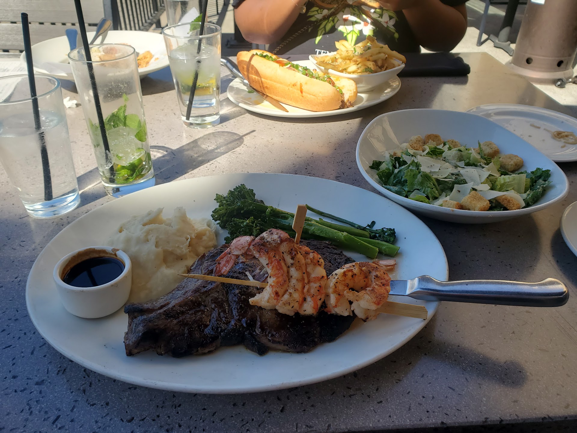 I arrived to a semipleasent hostess asking the party ahead of me for proof of vaccination and ID. I was not asked when it was my turn to check in. I was texted right when I stepped away. I was escorted inside again without being asked for Vaccination or ID cards. I informed the hostess seating me that one in my party was not fully vaccinated and asked to be seated outside (their policy). I am seated outdoors waiting and watch as the tables surrounding me are seated as well. I wait patiently a whole 30 mins before a hostess rushes by with drinks for a table seated after me. I ask her if I can get someone to the table to order our drinks. She comes back asking for our drink order stating she isn't a waitress but she'll get us our drinks while the place us with a server. We order two Malibu Peach, only for her to come back and inform us they don't have the ingredients to make it. We order a Pineapple Express and Mango Mojito. Both were flavorful and refreshing. A waiter comes and takes our appetizer order I ordered the Shitake Garlic Noodles (BOMB! by far my favorite dish of the day)My friend orders the Fried Calamari (she said were delicious),its now been an hour and ten mins from the time I arrived, the surrounding tables that were seated after me now have their food. We put in our entree orders at the Sametime as appetizers, of course the now new waitress comes to inform us the order is taking longer than expected but would be out shortly. 20 mins later my main course comes out, I ordered the Steak mashed and broccoli with shrimp (The shrimp had no flavor, the steak was decent although I was famished by this time, the mashed and broccoli were the best things on the plate) . My friend ordered the Korean steak sandwich (she described it as "Not bad, pretty good").