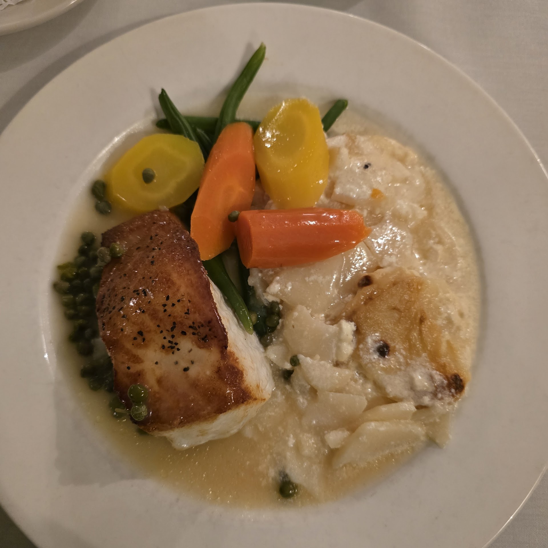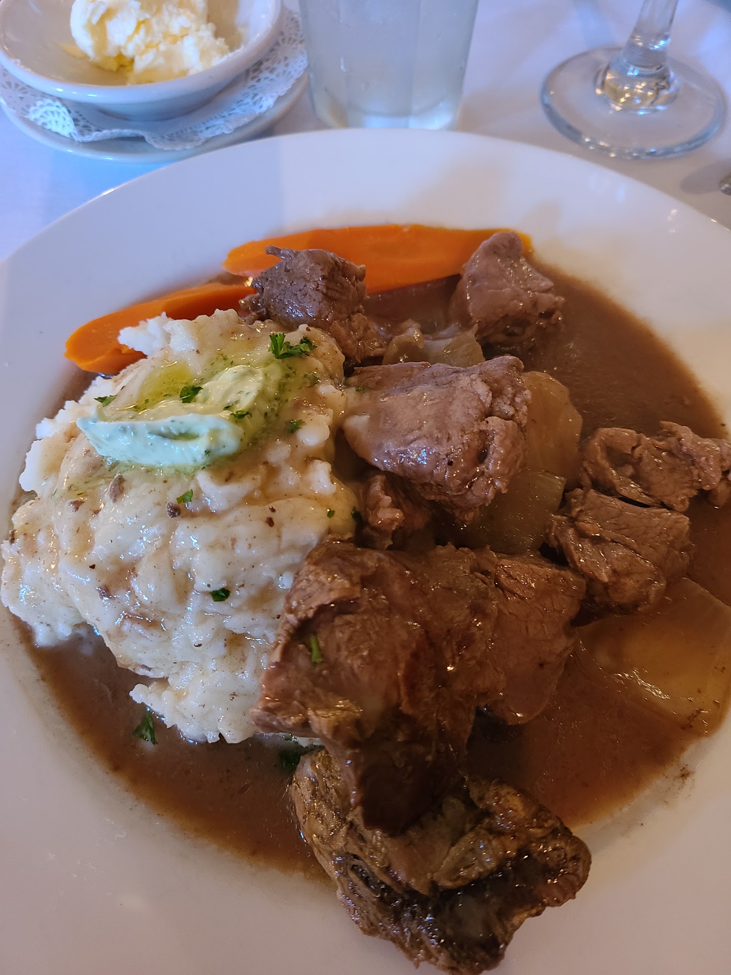 Up to this point the service was fine but our entrees took a really long time to come out. I'm not sure what the hold up there was. That said they came out piping hot and the steaks were cooked perfectly. The mashed potatoes were creamy and had some kind of garlic butter on them which was good but also lacking something. The scalloped potatoes were cooked wonderfully but needed a stronger cheese flavor. The fresh broccoli and carrots were cooked very well and tasted good. The shrimp were overcooked, sadly. The crab cakes were the best thing on the plates - very good for restaurant crab cakes.