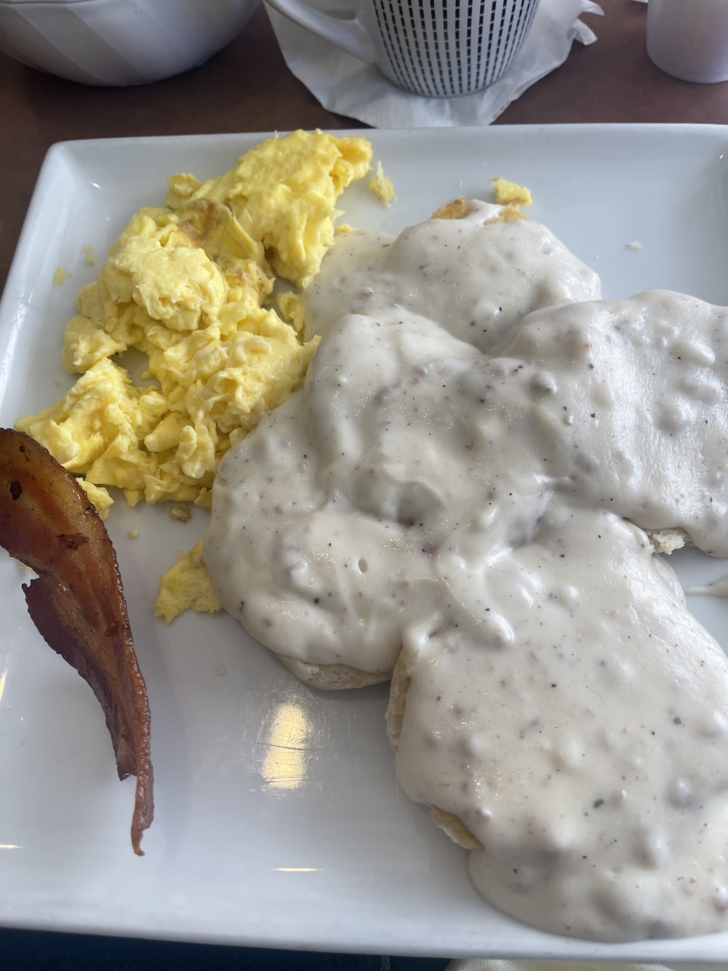 Anyway, back to the food. I had an Irish Skillet, with real fresh corned beef hash, made in house. The flavor was perfect. The potatoes in the skillet, which can always be a hit or miss, even at home, we're perfectly cooked. I did not have one undercooked or burned. Perfect. The veggies in the skillet were proportionate to the meat, another happy surprise. Personally, next time, I would ask for light cheese, but for cheese lovers, everything was perfectly melted. Best surprise was the requested over easy eggs , they arrived over easy, ! which allowed for the yellows to break and seep down thru my skillet. Joy ! My husband ordered a country skillet , but he managed to make it less than thrilling. No veggies and dry scrambled eggs. He loved it, but it could have been so much more ordered correctly. He is at fault here, not the cafe. He also ordered gravy with his biscuits, even the gravy got my vote.