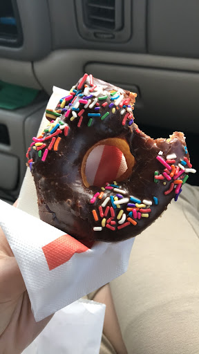 Read moreThe customer service was great, but the donut I ordered was probably the ugliest donut I’ve ever seen, and believe when I say I’ve seen a lot of donuts in my life. Although a women of my age should ask for a little more mature of a donut (if getting one at all) I still have a guilty pleasure of chocolate sprinkled donuts. This donut was just taken out of the bag once we had gotten out of the drive through. Despite its poor appearance, with its off shape, it had a chewy texture, and the frosting on top was sweet and melted. The added sprinkles were (as shown in the picture) minimum and patchy, but enjoyable...