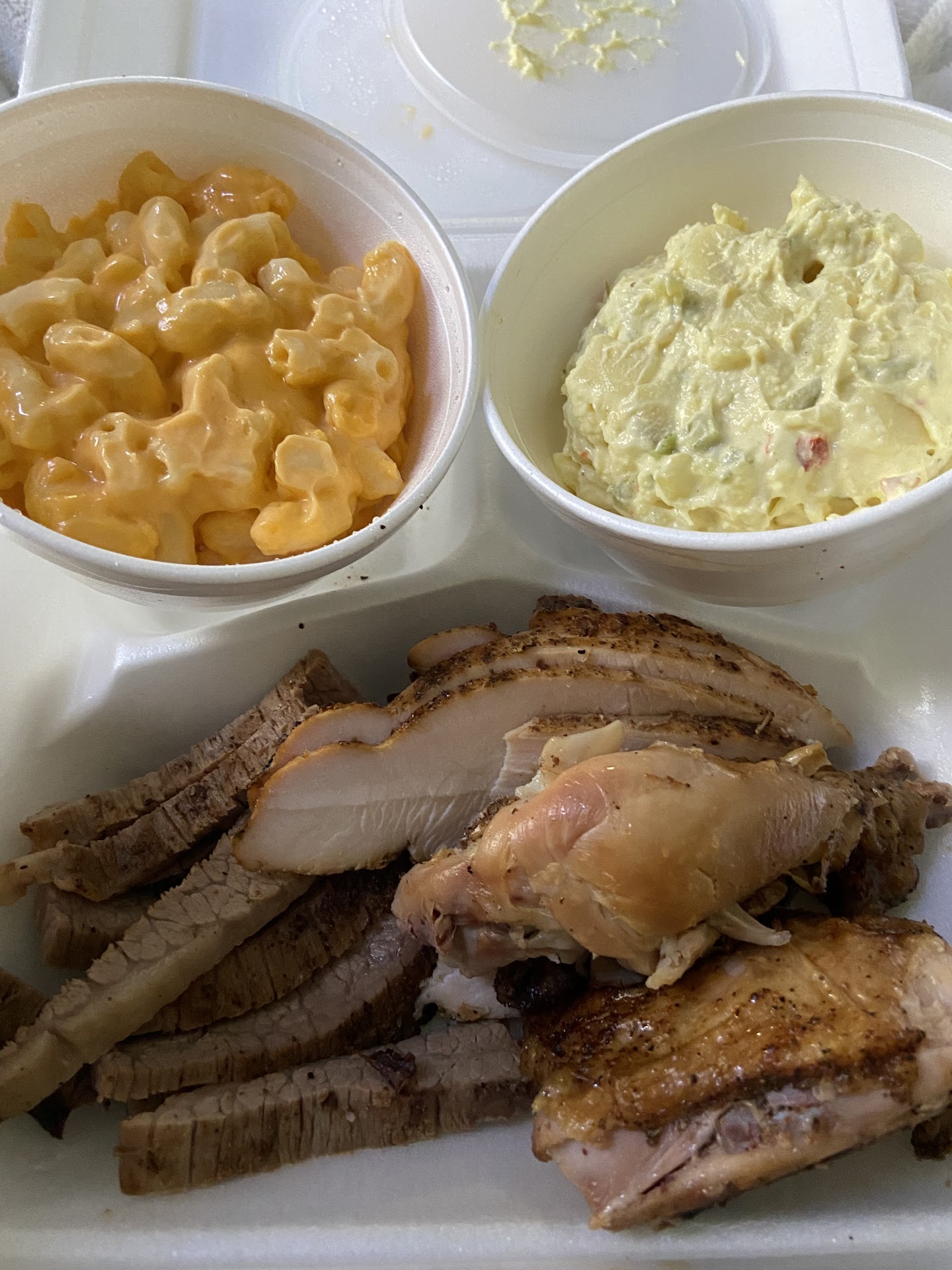 I ordered the three meat plate with marbled brisket, turkey, and chicken with potato salad and macaroni and cheese as my sides. I’ll start with the good - the chicken was pretty moist and flavorful, and the mac and cheese was good as well. The turkey has decent flavor, but it was so dry I could not eat more than a few slices. The brisket was not marbled, and it was incredibly dry and tough. What little fat strip they left on the meat was unrendered, and the overall texture was rubbery and unpleasant. Disturbingly, the only thing that arrived remotely warm was the potato salad. It’s temperature lead me to believe it is not being stored properly, so I stopped eating it after the first bite. Again, my delivery driver waited at the restaurant for my food to be prepared, and I live approximately 12 minutes from the restaurant. There is no reason my food should have arrived as cold and as dry as it did.