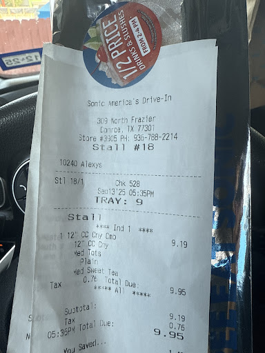 Read moreOrdered our food last night (about 8:30 so not thag late and there were plenty of people there so I wasn't a random show up) and debated writing a review and decided it was necessary, we got ordered a double cheese burger with tots and oreo blast, and a sour dough with French fries and a reeces blast, the double cheese burger was cold, was not put together properly and the bread was completely soggy, like it had been sitting on a shelf all day the tots were cold and soggy, the sour dough had no onions and had GOBS of mustard and mayo on it, like an obnoxious amount of them, the Texas toast was again completely soggy and the French fries were no where near fresh, also cold soggy, its like my entire order was just thrown in a bag after sitting on a shelf, the oreo blast was perfect but the reeces blast had all of the toppings just sitting in the bottom of the cup it was not mixed at all, had to pour it into a bowl and mix it ourselves, this sonic usually has decent food but this was just awful and unacceptable, literally didn't finish any of it and threw away nearly 25$...