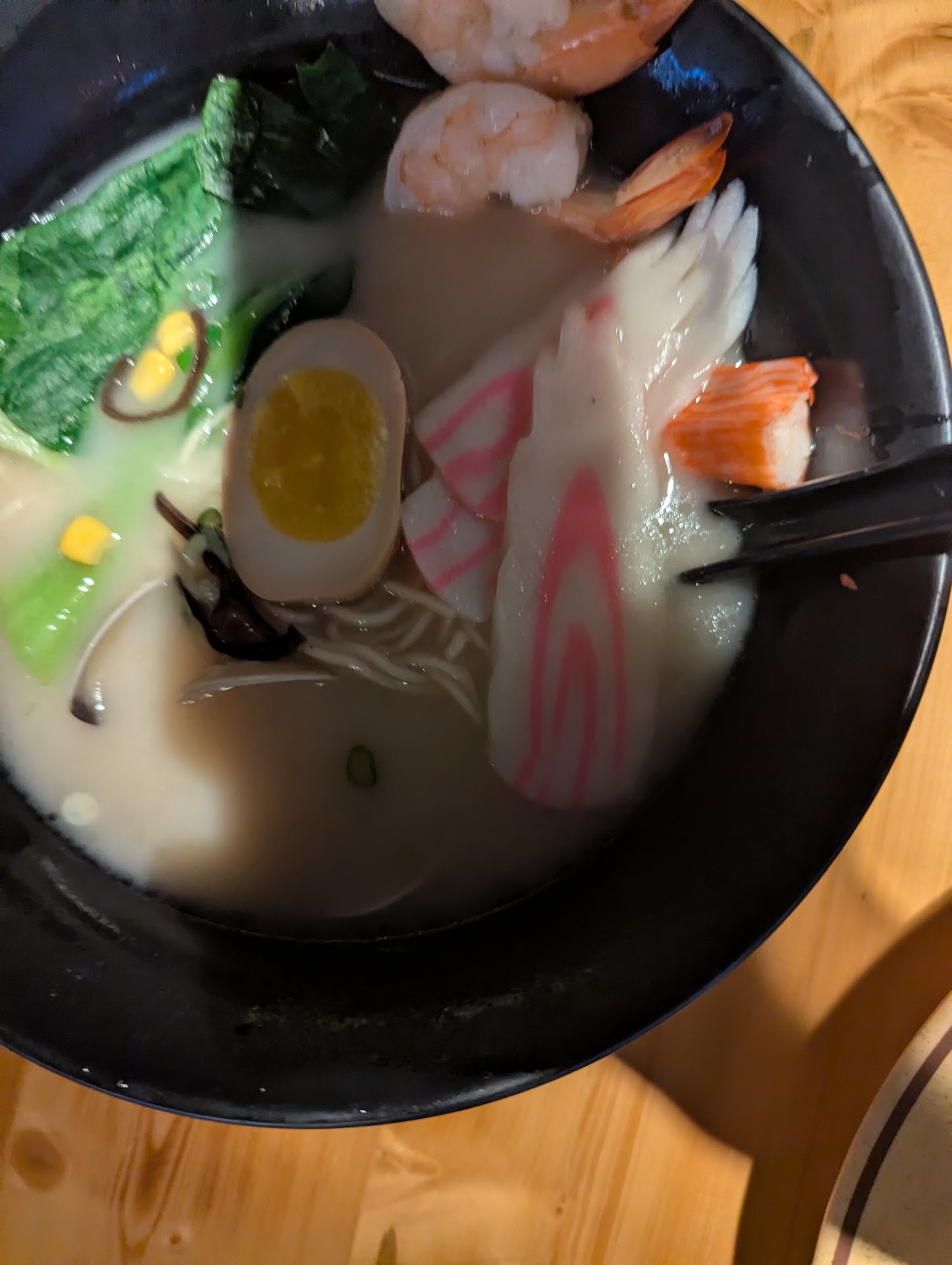 The seafood Raman's shrimp has absolutely no flavor on its own. It was super bland. I'm a little confused as to why it would be skewered and boiled in water as if a garnish, per our waitres (super sweetheart!) rather than have to hot broth poured over it with a quick simmer since they cook so quickly.