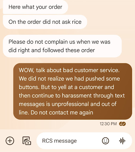 Absolutely unprofessional. I assume the woman asked to speak to his manager as I would of as well when I heard him yelling he was the manager. He kept yelling at her that she would pay for that bowl and she was trying to just leave as I would as well if you just made me look like that in front of everyone. This should have been handled so much more professionally. Attacking someone is absolutely not okay and it made me feel uncomfortable eating there. A manager should lead by example.