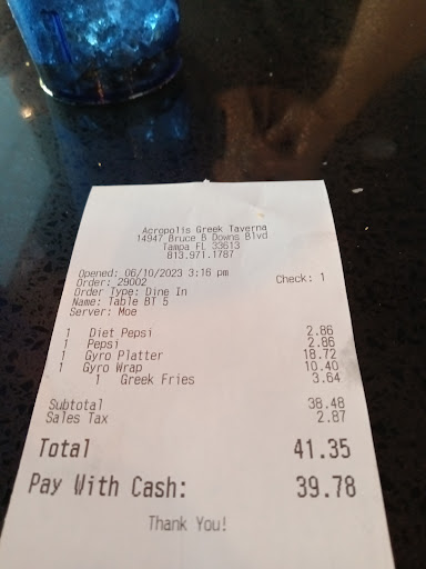 Read moreAcropolis New Tampa has some of my favorite Greek food anywhere in the city. Their pita bread is so good that I often get 2 orders, and my wife and I adore their Athenian chicken salad. I highly recommend it, as my wife and I get to-go salads nearly every Friday for a long time.
