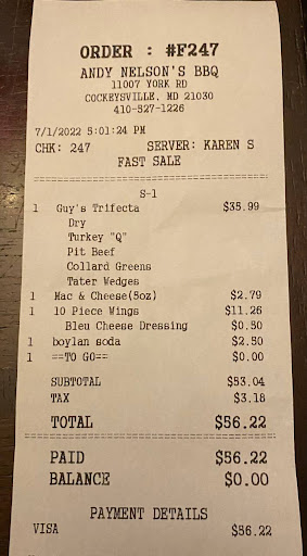 Read moreThis is a long review, but we don't do this often. Went with my husband on business trip to Hunt Valley for a week. Many places to eat. My husband went to Andy Nelson' s BBQ Joint for lunch one day with his business associates. He has eaten at a lot if different places on his business trips. Not easy to impress. That night he raved about how good the food was. The brisket tips sandwich was so good. He loved the BBQ sauce, And their steak size Fries. The regular size sandwich was huge. I was raised in the South where we love our food well seasoned. I've had more okay BBQ than really good, since moving up north. We went to dinner two nights later, and let me tell you it was Awesome! The smells as soon as we got near the door made my mouth water. The beef brisket sandwich was moist, tender, delicious and loaded. Guy's Pig Dip BBQ sauce was a wonderful spicy vinegary sweet sauce! Yumm! There was also a really good Mustard Cider Sauce. There potato salad was delicious and different than my normal potato salad. The best side I have ever had (at the many BBQ places I have been) was there to die for CORNBREAD! I couldn't have been any happier chowing down on this delicious food with my large iced tea and all of the adorable pig memorabilia everywhere. We stopped again on our way out of town and bought BBQ, potato salad and cornbread to take home. Three times in five days! We have never done that before. We also bought bottles of both sauces we enjoyed! Staff was nice and very helpful. We will definitely be back! We're going to BBQ chicken tonight and will be using the sauce...
