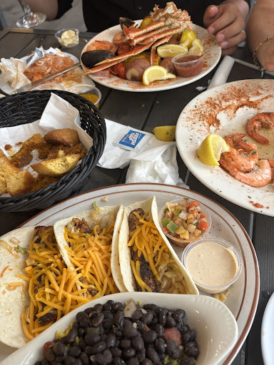 Was a little nervous about this place because some reviews were a little harsh, but I had a great experience. We were seated quickly, and once we were given our server, it was probably only 15 minutes before we had all of our food and drinks. We were still eating our appetizers when the entrees came! We got the cocktail shrimp to start, just note they’re served warm, but it’s delicious. They put a good amount of seasoning on the shrimp and the cocktail sauce tasted homemade. It’s not like regular cocktail shrimp, those bore me… I’d order these again. We then asked for cornbread, and our server brought us an assortment of cornbread, pumpkin bread and some type of sweet cornbread biscuit (I’ve forgotten the name of it!) some of the most decadent and moist pumpkin bread I’ve ever had, it was falling apart in my hands. We got low country boil and the fish tacos as entrees. Lots of food in the seafood boil. The tacos were great too, I was thinking about getting them already, but the server said that was his favorite thing on the menu and it convinced me. I thought the beans and rice were going to be basic and out the can, but I was WRONG! They had some delicious flavor on them. Everything was well seasoned. Overall great atmosphere and it’s reasonably priced for the amount of food you get and the view. We sat outside, and the squirrels were very playful! The location reminds me of the low country, with influences of Savannah or Hilton Head. Great sunset. Go if you’re in the area!