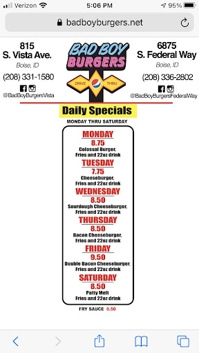 Ā Ā Ā Read moreGreat experience at the Bad Boy on Vista! Had the double bacon cheeseburger and onion rings. The rings were the best I've had in the valley. The portion was generous, the rings were a medium thickness cut, but still juicy and dense inside the breading, which was close to a panko style, and still crispy despite my 10 minute drive before I was able to start eating. The fry sauce I was given for them was closer to a 1000 island dressing style, with bits of pickle in it, rather than the more common ketchup/mayo style found around here. I was also given an excellent helping of the sauce in the single to-go cup, and was able to give each of my rings a good dunk without having to fear my last ring would be dry. On the burger front, I asked for mayo only instead of the fry sauce it would have normally come with, planning to add mustard and ketchup from packets available on the counter. The burger was an excellent size, with each patty being in the 5"+ diameter range. It came with 2 slices of nicely curled up bacon (i.e. cooked without a bacon press). The sesame bun was thin but held up well to the juiciness of the burger, and completely covered the patties without needing the extra to be torn off so you didn't have an extra whole loaf of bread. The American cheese was proportional for the burger, and tasty. The one let down was the shredded bag lettuce used, which was a bit wilted, and the two weak slices of tomato, but that may have been due to the time waited before burger consumption started, due to chowing down on those yummy rings. No pickles were noted. The amount of mayo was perfect. I will definitely be back. I should also state that I was able to bring half my burger home for later, because I was full. Edit: I should also add that service was very quick at the walk-up window at lunch today, and although I forgot to ask for no ice in my soda, I still got more soda...