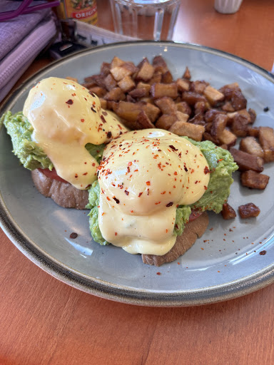 We are only giving this 4 stars because of the wait but honestly it was worth the wait! We got there around 9:45 and the line to order moved fairly quickly. Almost all of the inside tables were full but there was some bar seating available and the whole patio was open but it was a little too cool this morning. By the time we left they had posted a sign they were suspending food orders for 30 minutes to catch up and would resume by 11am. The food made up for it. I’m a stickler for coffee and boy was I more than happy with a plain drip today and I really appreciated that they had simple syrup available at the self service station. My fiance got a mocha that they spared no expense on chocolate! His breakfast burrito looked incredible and he had no complaints and loved the potatoes. I got the Cali Benedict and oh man was it absolutely worth it! Not only did they swap the English muffin for GF toast but it was overflowing with avocado, not stingy at all!