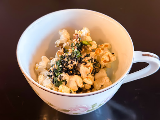 First course comes out and it is popcorn with sesame seeds and herbs. A unique experience and flavor but wasn’t what we had invisioned for this kind of meal.