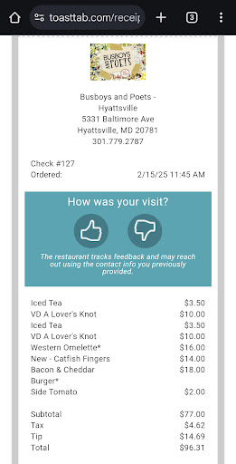 Ā Ā Ā Read moreWe were there for the Marcus Johnson event. He's the reason, they're getting 3 stars for atmosphere. That space was nice. The service however, was VERY slow, very disappointingly slow. We ordered shortly after being seated and didn't get our appetizer (catfish tenders) until an hour later and they weren't even hot, barely lukewarm so we know they had been sitting before being brought to the table. While eating them, our actual meals arrived, again signalingis to believe our appetizer was overlooked. Before that however, I was given the wrong drink from the bar and made to believe it was correct. I was given a sparkling, fizzy drink. I ordered a LEMONADE based drink, not a sparkling one. When the correct drink came, the glass wasn't full and it was clearly lacking alcohol. I ordered the western omelet and asked for tomatoes to be added. There were NONE in my omelet. My grits were so lumpy, i didn't want to eat them. They looked dry too. My husband had a bacon cheeseburger with nothing on it but they brought him two tomato slices on a plate which he didn't eat because he doesn't like tomatoes and didn't ask for them. I asked for butter and GRAPE jelly. I prayed they'd be brought before my lumpy, lukewarm grits were cold. I got ice cold butter that didn't even melt in the grits and every flavor of jelly EXCEPT the grape i asked for. My husband's bread on his sandwich was hard. He commented that it must have been sitting under the heat lamp too long. Looking at the receipt I now see tomatoes were not added to my omelet but added as a side and brought to my husband with his burger and ultimately thrown away because he doesn't eat them. Never would i have thought my TWO DOLLAR tomatoes that were supposed to be in my omelet would be brought on a plate. This location is NOT equipped to be open, at full capacity, in the front AND to service an event of this size. I'm heard this location is terrible and now i see why. This location is an embarrassment to the Busboys and Poets brand. So glad this is not the closest location to me. I'll never visit this location again. If I wasn't understanding that servers are underpaid already, I would have left less of a tip than the one...