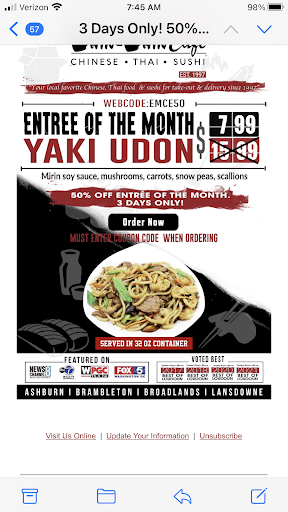 We ordered take out. We typically get a couple of entrees and often add their emailed special. I phone in the order because many online menus have much higher prices and take a substantial percentage from the restaurant. When ordering, I specifically noted the special as noted in the email. When I got there and the cashier noted the amount, I said that seems high. We reviewed the items; he said the special price requires on line ordering. I said I mentioned it and why would it just be online? An older woman joined him and they were adamant that it was my mistake and the email clearly notes on line. I looked at the email this morning and it does not state on line only. It gives an online code but does say available only on line. The food was good, hot and all items present. They staple the bag so one cannot check it. Last time we ordered, a couple of weeks back, we were shorted a rice.