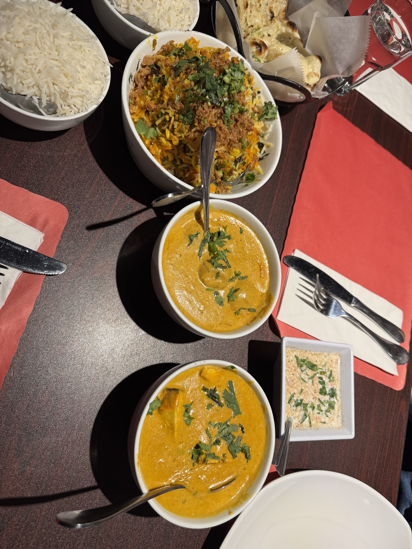 We had a small incident of lost in translation: one of us ordered lamb curry, and the other chicken korma but we both ended up with chicken dishes. The popadums were ok, the spice level of the entrees was good for my taste but medium was too hot for my companion.