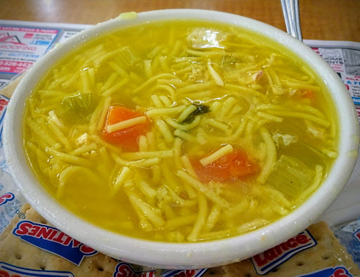 The service can be very sketchy here. A few waitresses are excellent, others are off-hand, abrupt & inattentive. It's a gamble. A lunch special was worth going for. I had a monster Buffalo chicken tenders salad. It was loaded with long strips of freshly roasted chicken bathed in a Buffalo coating. The zing was mild, but cumulative. My wife had the Tuna Salad-Stuffed Tomato. We started with the lentil soup. Hearty & tasty. She had a cup. I upgraded to a bowl. It was tasty & filling. On Wednesday, the lunch special was peppered steak. A hearty meal with large segments of seared steak mixed with peppers & mushrooms in a rich sauce, over a large bed of rice. On a Friday, the Steak Stew special or the Rockfish sounded good, but I went for the Chicken & Avocado wrap [see the photo]. It's tasty & really big. Good for a hearty appetite, or take half home. Lots of slices of avocado & chunky pieces of chicken. This is well worth a try. I had a bowl of the day's chicken noodle soup--see the photo. It was tasty & big. A cup of it came free but my upgrade toa a bowl was only $1.50. We also had a burger with no bun--there is a "bunless burger" on the menu that also sounds good. See the photo. The Mondays' dinner special, prime rib steak, is really good & amazing value. For about $19 you get a prime rib with bone covering 2/3rds of your dinner plate. About 1 1/2 inches thick. Plenty of au juice gravy. The baked potato comes on another plate. Also included is your cup of soup. We like the chicken noodle or the navy bean. And, a side salad. We like the Parmesan salad dressing. It's tangy & creamy. They may run out of the prime rib, so plan on a late afternoon or very early evening meal. Split pea soup is always thick & tasty. The croutons are homemade. The daily specials included corned beef & cabbage. Generous slices of flavorful corned beef covered a high platform built from moist segments of cabbage & chunks of boiled potatoes. Highly recommended for $17.99.