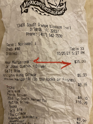 On top of that, we were erroneously charged for the Mega Margarona, which we did not even have; so an extra $35.00 on the bill, and I still left a tip for Server Norismel.