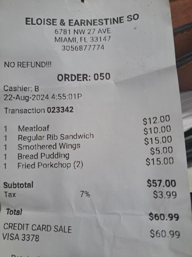 Read moreLooking for a legitimate soul food restaurant in Miami as I am a recent retiree in south Florida from Philadelphia! So I have a pretty good history with soul food southern cooking. Took a trip down from Miami Lakes on a wet Thursday afternoon to the 'hood! This place is as no-frills as it can get! A few tables, order at the counter, no waitress service as most people do take-out! Very nice menu with all the favorites at super prices for enormous plates of food! Each platter includes your protein, choice of rice & 2 sides! They also do breakfast & sandwiches! So place your order & wait about 5-10 minutes! They also accept credit cards! I ordered a lot because I planned on eating a little at the restaurant & taking the rest back home. I ordered the Meatloaf & a Smothered pork chops & Smothered Chicken wings & a small order of pork spare ribs , along with a bread pudding! Collard greens, Yams, Mac & Cheese, baked beans were my sides along with pigeon peas & rice! The food is tasty, freshly made, hot & very nourishing! This is not fancy anything just good old- school soul food for the locals, no tourists! I copied the bill! Shout out to Brandon, the manager for...