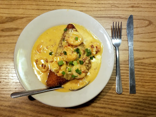 FOOD: My son ordered the kids fish & chips meal rather than the swordfish he said he originally wanted. Funny enough, this thing was no joke for a kids meal. Lol. I mean really...these were strips of fresh, flaky white fish in a fresh batter, lightly fried golden brown. As for the chips...once again, house-made thin slices of potatoes, deep-fried to a moist, but crisp texture (homemade potato chips). The kids meal was some good, gourmet sh*t and went well above my expectations. There was nothing left after my son ate his and allowed me the opportunity to have a bite. Nice surprise that Fish Bites also caters their culinary artistry to our young ones. I have been on a journey to taste shrimp & grits around Wilmington...so this was a must this evening. I wasn't starving but had a light hunger so I ordered the small portion and a Budweiser to drink with the miniature cornbread appetizers, but prior to my entree. Once served, the shrimp & grits appeared to have a golden-fried filet of fish under the blanket of creamy cajun sauce and sauteed shrimp...but it turned out to be the pepper-jack cheese grits, lightly fried in a parmesan crust. This dish was interesting because it plays on the traditional, southern shrimp & grits but offers up that beautiful crunch, blended together with that dreamy, cajun sauce (was that a dry white wine in that sauce?). Yum. Honestly...I thoroughly enjoyed it. Although it is not the absolute best shrimp & grits I have ever had, only due to overall flavor, alone...it's very close. SCORE: 4.85 STARS!!