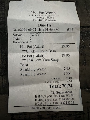 Overall: Hot Pot World, she’s got some good bones, like a sturdy ship. Clean, convenient, aye, but with slim pickings fer food, small portions, and no sweet treats, ye may find yerself sailin' to other ports fer a heartier feast. Should they fix these shortcomings and offer a broader bounty, she might yet be a finer place to...