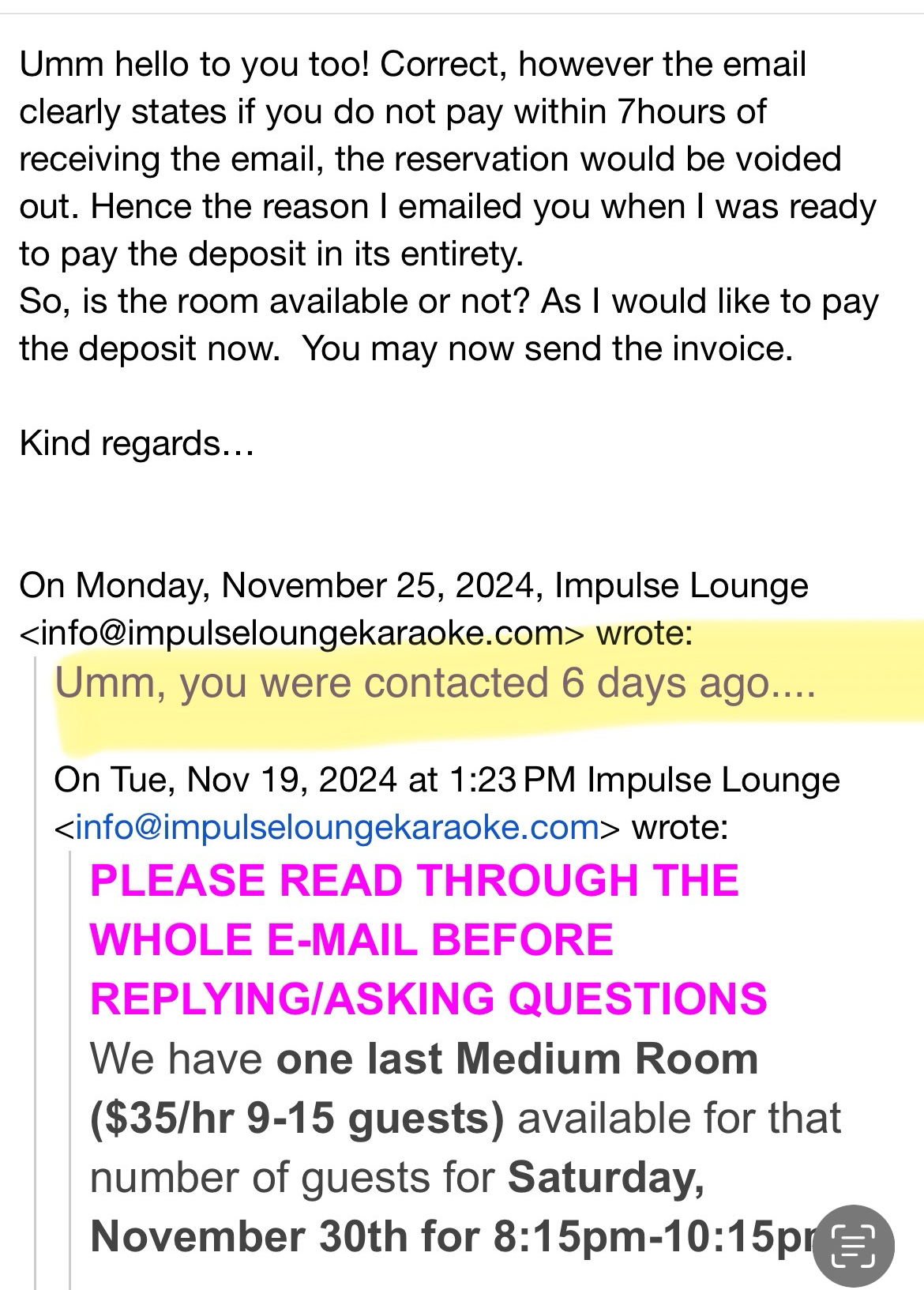In conclusion, Impulse Lounge is a place to be avoided at all costs. The poor customer service, dishonest practices, rude staff, and consistent lies create an atmosphere of sheer disappointment. Save yourself the trouble and find an establishment that values its customers and provides a pleasant experience. Impulse Lounge has proven itself to be nothing short of a nightmare. Needs New Management! It was utterly disappointing.