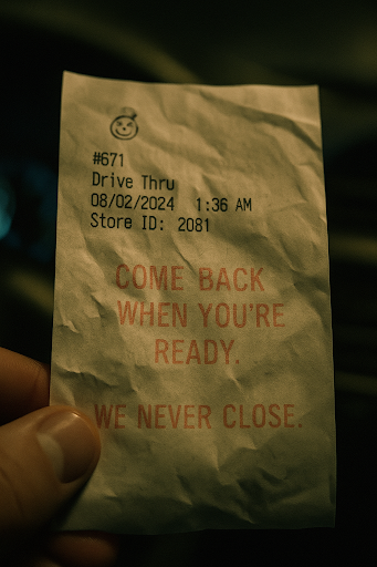 When I got home, I opened the bag. The fries were still hot. The burger still fresh. But the receipt — the receipt just said one thing, printed in faint red ink: