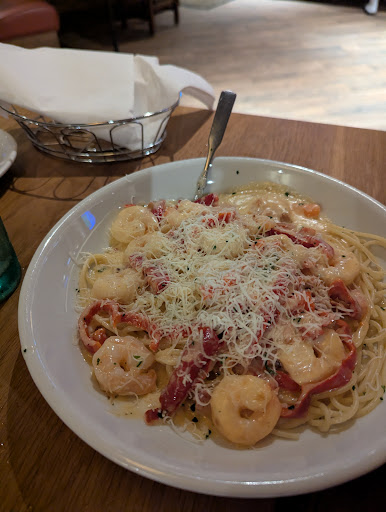Another 10 minutes or so a different worker brought out our appetizer. And didn't offer to refill our empty waters. We had enough time to slowly eat our app (maybe 15 minutes) before our salad/soup came out, again brought by someone different. That person, who appeared to be a manager offered to get new water. She did not take away the dirty plate or cups and did not offer cheese for the salad or soup. The soup was also the wrong kind but got swaped. Another 10 minutes our original waitress comes and removes dirty plates and cups. Another 10 minutes or so and a different manger brings our meals. Now I ordered something specifically with sautéed shrimp. The kitchen did not use sautéed shrimp, it was just the normal pink cooked shrimp. Just went with it because it had taken so long already. Pic added, supposed to be the carbonara. Had to ask for cheese on top for both. Our original waitress stopped by minutes later to check in, we asked for to go boxes and breadsticks. ANOTHER 15 minutes for her to bring that.