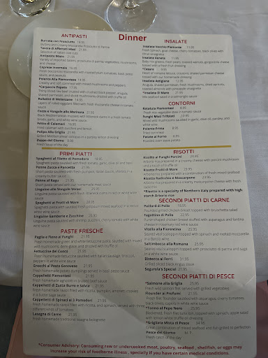 Osteria Vecchio Piemonte is a delightful little Italian bistro. My party of 4 had a Saturday evening reservation. Upon arrival, we were promptly seated and our water glasses filled. The tables have white tablecloths, and the waiters were tuxedoed. The menu is fairly large and diverse, with a something for everyone. We started with calamari and a cheese board (offered off the menu as a special), progressed to share the Agnolotti Piemontesi, then I had the beef shank (another off the menu as a special), while others in my party had Saltimbocca, the fish of the day and Fettuccine del Cuoco. We concluded with a lemon cake and cannoli. All of the food was absolutely delicious – probably not the best you’ve ever eaten, but you certainly won’t be disappointed. And the wine list was great, with plenty of good table wines at moderate prices – the Barolo was really good. As good as the menu, food and wine were, the best was the service, which was very attentive and friendly but not intrusive, This is a small restaurant, perhaps 15 tables, and it was full (although it isn’t cramped) – reservations are a must for Friday and Saturday nights. I would highly recommend...