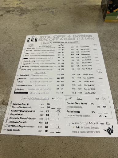 Read moreWhile shopping at Miramar outlets today we stumbled upon a delightfully R.A.D. Winery and Cidery! A casual beach style at first glance and as our experience continued with the ambitiously personable Megan.. the fruity layers of flavor in their fermented confections blew our minds! Now we’re open to a whole new R.A.D. World we didn’t even know existed and Megan even invited us to experience their new location on Corkscrew! We’re leaving with several bottles of wine and our awesome new tumblers that we will be sure to bring back for our $10...