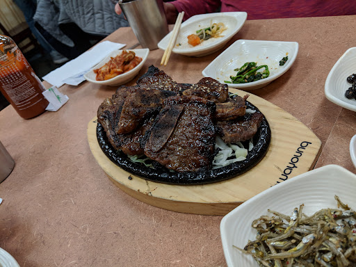 This is not the high brow Korean restaurant you're looking for, but it is a good and a basc example of Korean food. When trying a new Korean restaurant, I always order the Bulgogi and Soju, it's the same as ordering a Burger and fries with a beer at anywhere USA. The first promising sign was that I not only got a healthy plate of thinly shaved and cooked meat, but I was also surrounded by a collection of sides. Each side is a tasty little bit of contrasting flavour to the Bulgogi, which you eat together. At first you may think that there are not enough sides for a sampling with every bite of meat, but I soon discovered that it was the perfect ratio of sides to meat. And yes, there is also a small bowl of rice. The food price was not a surprise, but the small bottle of Soju was twice the price of the liquor store. To put that in American, you're talking about a 9-10 $ Budweiser. OK, confession time. A bottle of Soju is really a 2 person ordeal, so I was feeling a little glutinous. I would not say that this was Korean fine dinning, but they don't pretend to be anything other than a Korean diner, and for that I have a lot of respect for the food they serve.