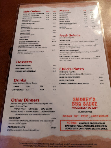 Read moreI was at the Olive Garden when a young man overheard me talking to the bartender about wanting some good barbque. He interjected, telling me that Smokey's Bar-b-que was the cleanest place he had ever worked. He also stated he loved the family and felt like they were the best employers he had ever worked for. He didn't stop there. He told me they made EVERYTHING homemade, unlike Sonny's barbque that brings in a lot of already prepared foods.
