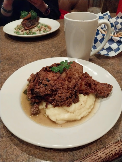 My parents both had the fish sandwich which they loved. I ordered the brussels and tempura green beans; both were fantastic. I preferred the beans dipped in my mom's blue cheese dressing, but that's strictly personal preference as the ginger sauce it comes with is very good - I'm just a huge lover of all things blue cheese. I've got my eye on that fried chicken dinner for our next visit!