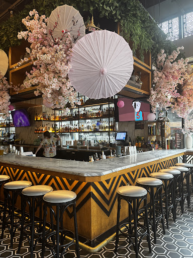 The restaurant is beautiful and spacious, there's a cherry blossom theme currently with a really cool pink decorated phone booth in the front before you walk in and themed menu. The bar is very nice as well, my parents took a picture in front of it.