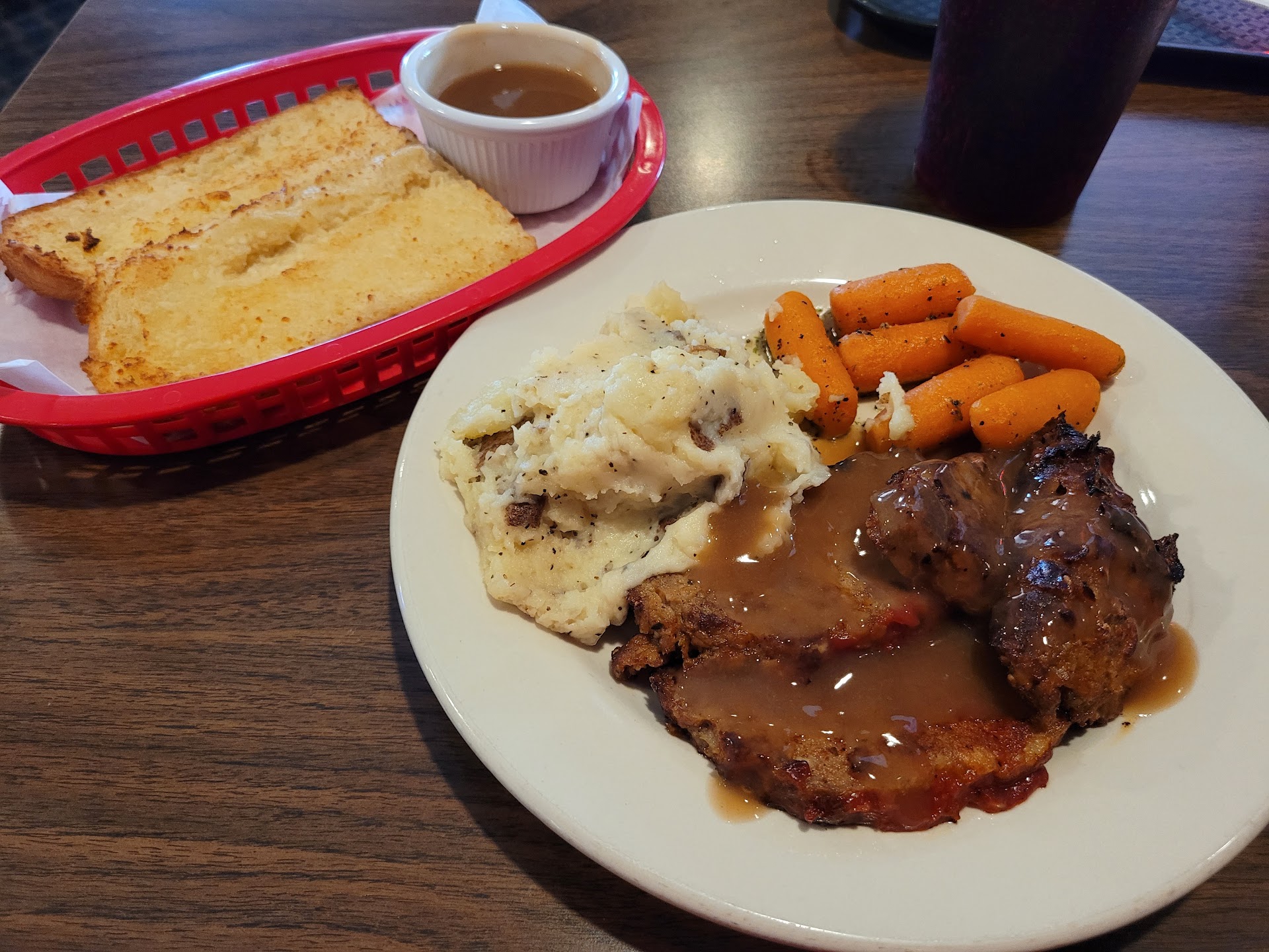 So before you think I'm crazy for ordering meatloaf at an obviously Italian restaurant, it was the special of the day and the cashier said "it's amazing and made only once a month." Man, she wasn't kidding! It's got to take a whole month to make a dish so delicious and filled with homemade goodness! ❤️ First off, let's talk about the garlic bread... who woulda thought something so simple could be so delicious, but it was: Toasty buttery goodness!! The obviously hand-mashed potatoes w/ just the right amount of potato skins mixed in this fluffy, creamy mixture was the absolutely perfect side for the main attraction, THE MEATLOAF! Great meaty texture with crisp edges off the grill and an amazing velvety brown sauce like I've never had before. I ordered it on the side as I usually find them not to be so delightful, yet I found myself pouring it over the meatloaf right away and dipping everything thing I could into it! Even those unassuming baby carrots in an herbed butter sauce were able to shine through on their own in this amazing cast of characters! Need to start marking dates down on my calendar as the last time I was here I had the Chicken Fried steak, which was also monthly. Hopefully, eventually, I'll get to some of the other dishes on their menu! Last thing, if you've never been here, every inch of this place is filled with movie star memorabilia from throughout the past decades. It's a quiet, and dim, and extremely relaxing atmosphere to escape from your daily...