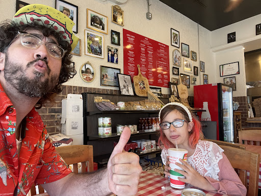 The checkered table cloths, classic pizza shop inside, had some good Italian lemon soda, some good ol fashioned Dean and Frank playin…