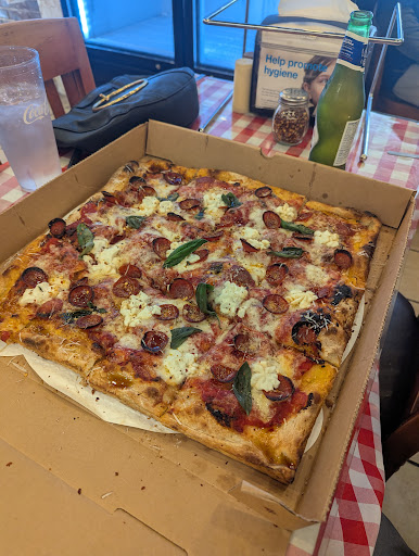We ordered the Roman-style Pat's Hot Honey Pep - Cupped Pepperoni, Hot Honey, Ricotta, and Fresh Basil. Once it was ready we were easily able to pull up at a table and feast. THIS PIZZA WAS UNBELIEVABLE. The Roman crust was unlike any I've had up until now (& this include Sicilian-style). A high hydration dough makes it light, airy, and crispy with a slight char on top. Unlike Sicilian-style, which comes off chewier and more dense. The square pie with sweet, salty, earthy, and hint of spice for well balanced flavor represented in every slice. My fiance & I were highly impressed. And top it off, the owner(s) were both extremely kind & informative.