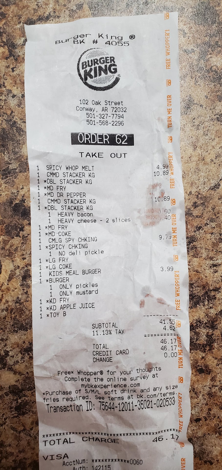 Read moreFor spending almost 50 dollars to feed a family of 4 I expected the food to atkeast be correct. I was more than patient with the store which had a new hire working the front desk cashier who had to stop and wait 2 minutes for assistance from another employee to ring up my order because they didn't know how to enter it onto the screen. Should train employees before putting them on the main front desk, it isn't the best idea to not have a trained person on the main counter. Moving on, once my order was rang up properly, move to getting back to the house with the food I ordered for each family member....the order was entered correctly (took awhile due to lack of training) but it was prepared incorrectly. Kids hamburger ordered as mustard and pickles only and received it as ketchup only.....seriously....spicy chicken sandwich ordered as no veggies and recieved it with extra lettuce....wooowwww for real..... please take the time to train your employees especially if you're going to put them up at the front counter as the face of your company to hundreds of people, and tell your cook staff to slow the heck down and read the screen and make the food the way it's supposed to. Honestly with the way those two sandwiches came out wrong, it's the exact opposite of how they were ordered and makes me think it was on purpose because they wanted to be funny and mess with someone's food. After spending 50 dollars for incorrections, I am not pleased at all with these meals or the amount I paid for someone to mess up my dinner. Get it together...