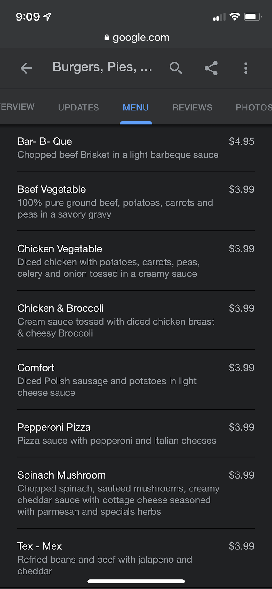 The staff are very friendly. The food was generally well prepared and exactly as we ordered it. They brought our food to the table, and that was nice. Just as the title, they have burgers, fries and fried pies. They also have shakes, fountain drinks and tea.