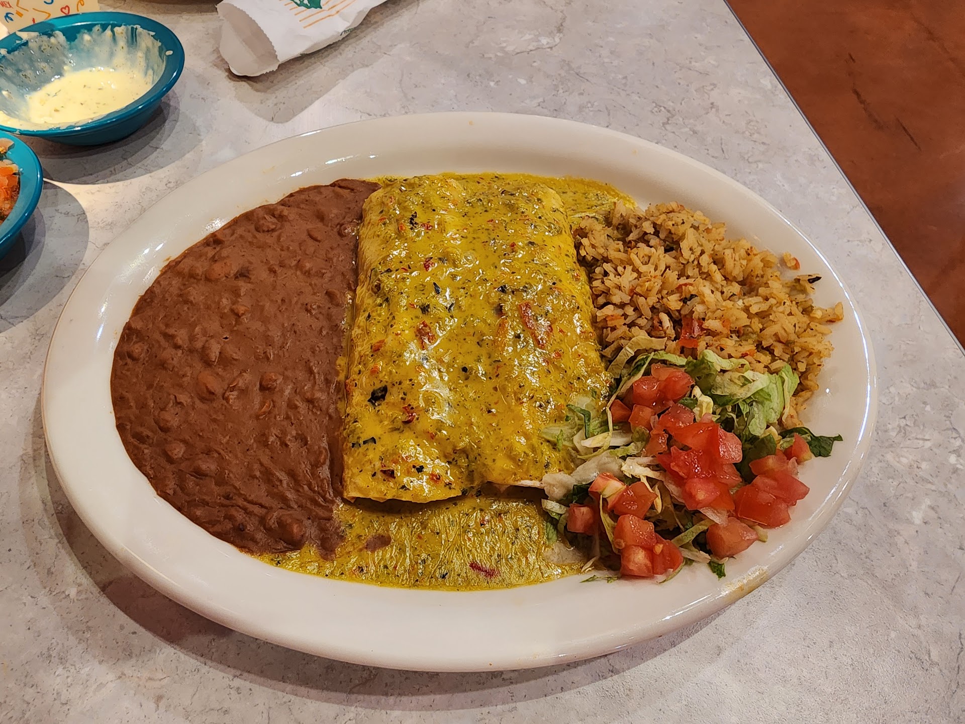 When we got there it was busy and they took our name. We waited outside out of the way until we got a text to be seated. We were taken to a table on the covered patio that was in the sun. We opted for the table in the shade and as we were being seated a group came from behind us with another wait person who started yelling that we were sitting at their table and that they were in front of us and that they had chosen that table as they walked around to the entrance. The wait person asked us if we would mind moving to the sunny table but we decided to stay there. Then, the other table insisted that our wait person was supposed to wait on them as they had specifically asked for her. A group of your staff (4) stood there and let these crazy people tell them what to do. The other group only ordered children's plates and water while our group of 5 ordered full meals and appetizers. The wait person we had was okay but seem unsure how to deal with the situation. I had a Chile relleno that was really fresh and good but there is a spice in your refried beans that gave me instant heartburn. We ordered some extra sauces that were rather good as well. We only ordered teas, sodas and water as we were going to the hospital afterwards to visit a family member. Just maybe train your staff to deescalate entitled customers. My sister was concerned that their wait person didn't get tipped for serving that group. They were obnoxiously loud to boot. We got a sampler plate that tasty but our appetizers came at the same time as...