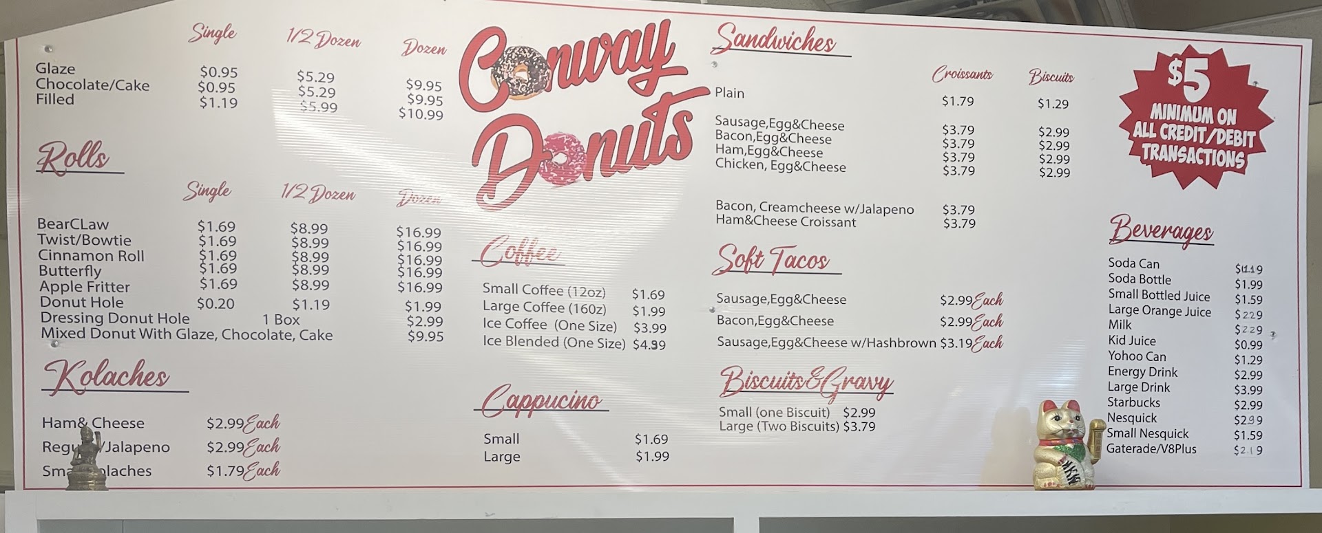 Read moreAmazing food, great prices, they usually have what you want even up to 30 minutes before close. Very fast service. The absolute BEST blueberry cake donut I've ever had and they have boudain (rice and sausage in a kolache) which you can't find really anywhere else in Conway as far as I've seen. Great place, kind employees. A million times better than any fast food breakfast and...