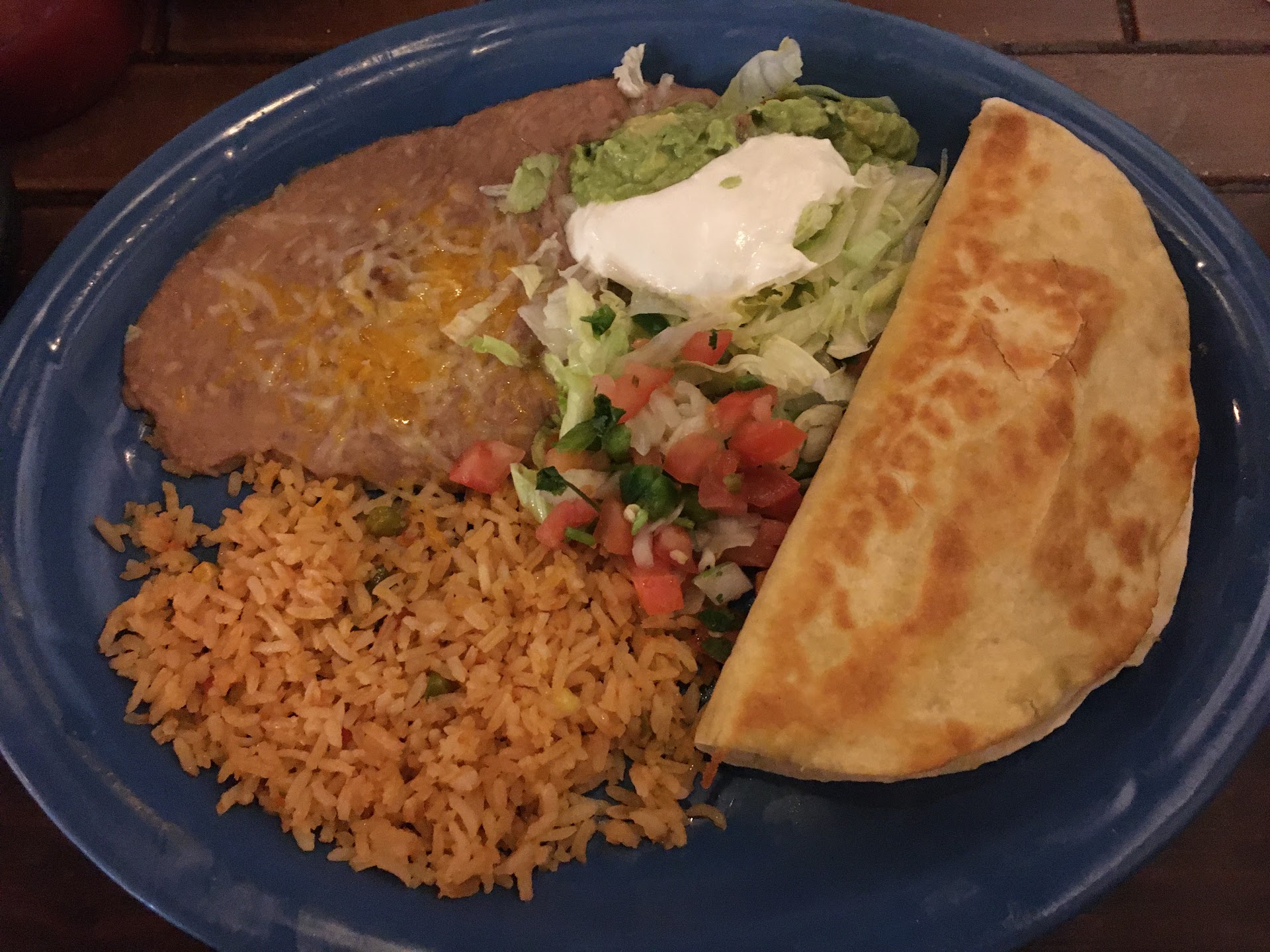 This restaurant looks like fine dining inside but has the prices of fast food; it was very affordable for a sit down dining restaurant. Upon being seated we were given a basket of chips and salsa. The chips were warm, crisp, and fresh tasting. The salsa had a little bite to it, medium heat, and tasted homemade. The only problem with the chips and salsa is that they were so good we almost filled up on them and had little room for food. The meals came out with generous portions. My husband ordered enchiladas mexicanas. It was three enchiladas, 1 beef with red sauce, 1 cheese with cheese sauce, and 1 chicken with green sauce. His meal also came with rice and beans. My husband is very picky with his rice and he absolutely enjoyed the rice that came with his meal. The beans were nice and creamy. The main meal, the enchiladas, he enjoyed all three of them and savored every bite. When asked which enchilada was his favorite he said he could not choose because all three were very good and the flavors complemented each other. I ordered the quesadilla rellena with chicken which also came with beans and rice. The chicken appeared to be either pulled or shredded. It was very juicy which made it a tad messy but was quite tasty and flavorful. The quesadilla was not what I had imagined a quesadilla to be; in my opinion it resembled more of a soft taco, however I really enjoyed it and would most definitely get it again. Our waiter was friendly and kept an eye on our drinks to refill them and checked on us several times even though it was a busy day. We ate there on a Sunday and it appeared to be quite packed for lunch. The ambiance of the environment was very enjoyable and everything looked clean, even the bathrooms were maintained. We would recommend...