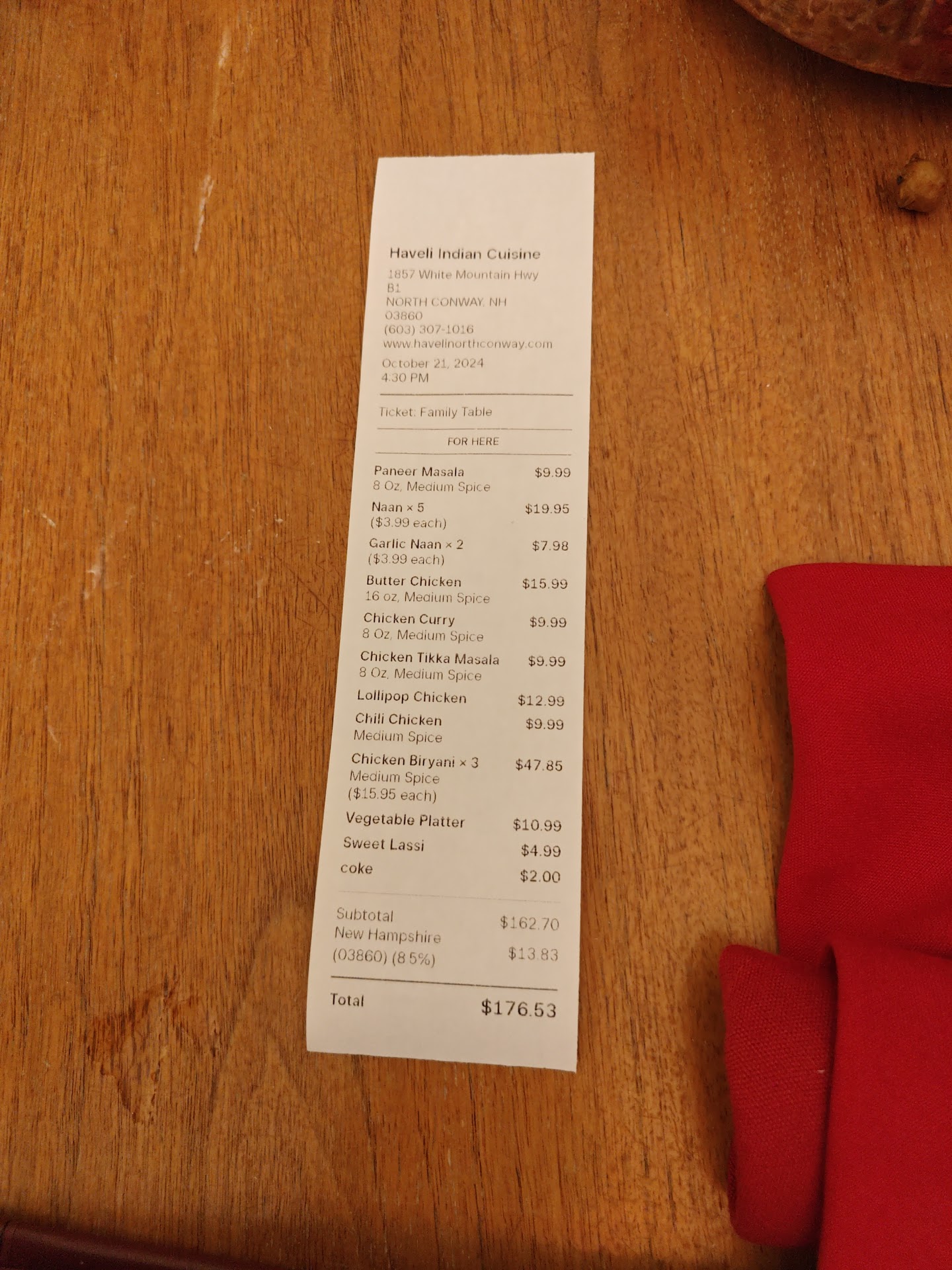 Read moreI cannot give this place enough stars. The food here is so freaking good. I had been craving a good curry dish for the last few years and had tried several different restaurants in North Conway, but none had satisfied my craving. A couple months ago a friend suggested Haveli. They were hidden away in a building of businesses that I had not paid much attention to in my many drives in and out of town. It only took one visit for this place to jump to the top of my preferred list. I have been several times and the food is consistently delicious. I order two to three dishes everytime I go, and make sure to try something new every time. I love the Masala Dosa, as it's gluten free and vegan and I am also a huge fan of lentils. Their Lollipop Chicken appetizer is so good. Garlic Naan? A++. Butter Chicken? A+. Curry Chicken? A+.