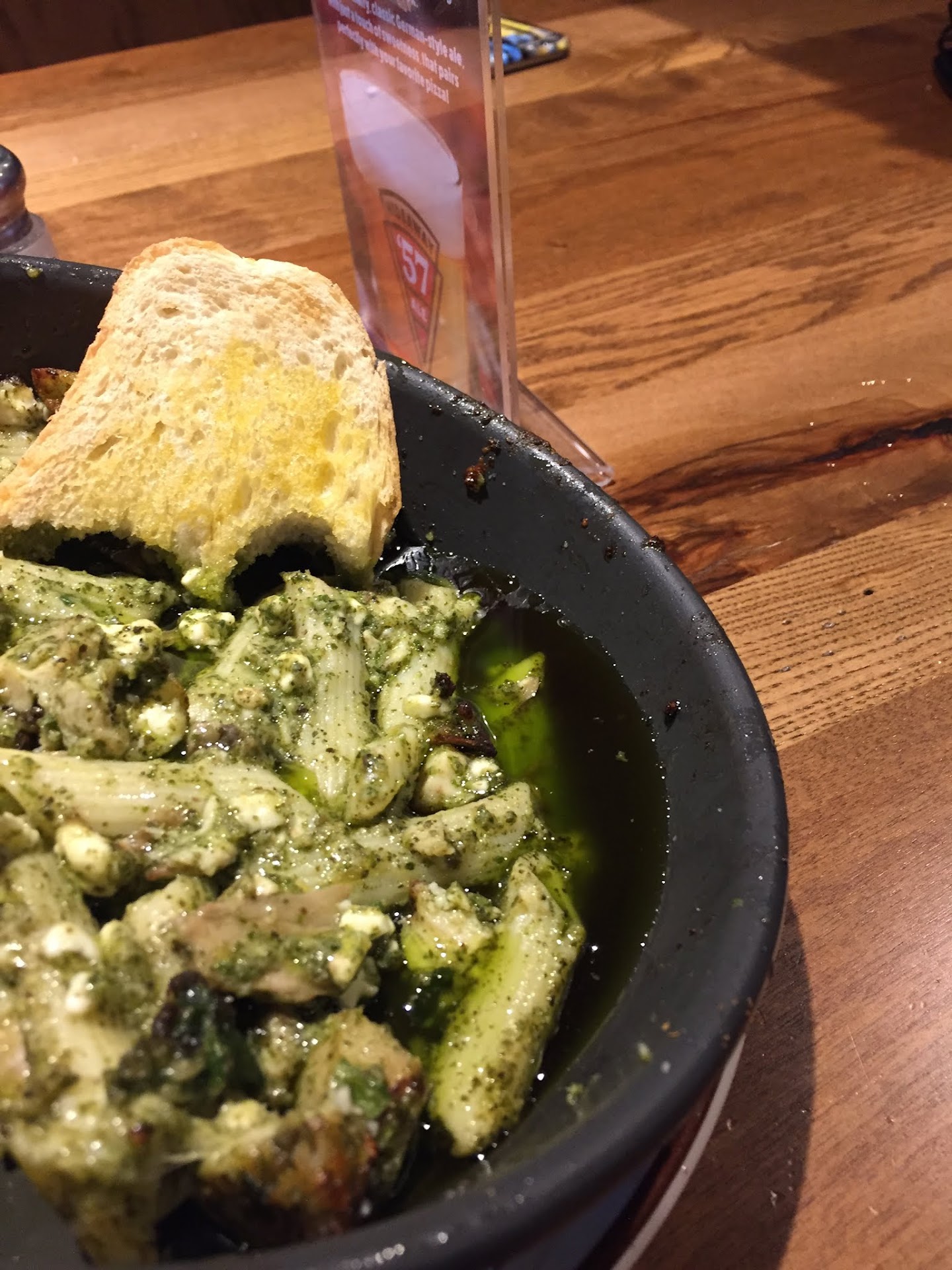 My pasta, however, left a lot to be desired, and I have to call them out for that as they offer six or seven different pastas on their menu and - as such - I feel that they ought to know better. I had the chicken pesto pasta, and while the flavor was OK (a bit heavy on the garlic for my tastes), approximately 40% of the dish was inedible due to the OIL. There had to be a full inch of oil swilling around in the bottom of the pan that they baked (and served) it in. It was actually quite disgusting - so much so that I took photos, which I have posted here as an example. In an effort to be able to eat as much of it as I could, I unfolded a napkin and adopted a blotting technique.....but, really? C'mon guys. Where did this oil come from???! It's pasta, pesto, chicken, mushrooms and some kind of cheese. If the cheese you are putting in to the dish creates that oil in the bottom then you need to STOP - otherwise, you need to re-examine your recipe and see what you are doing wrong. I make pasta dishes all the time and this oil....? Yeah it's never there. It was truly disgusting.