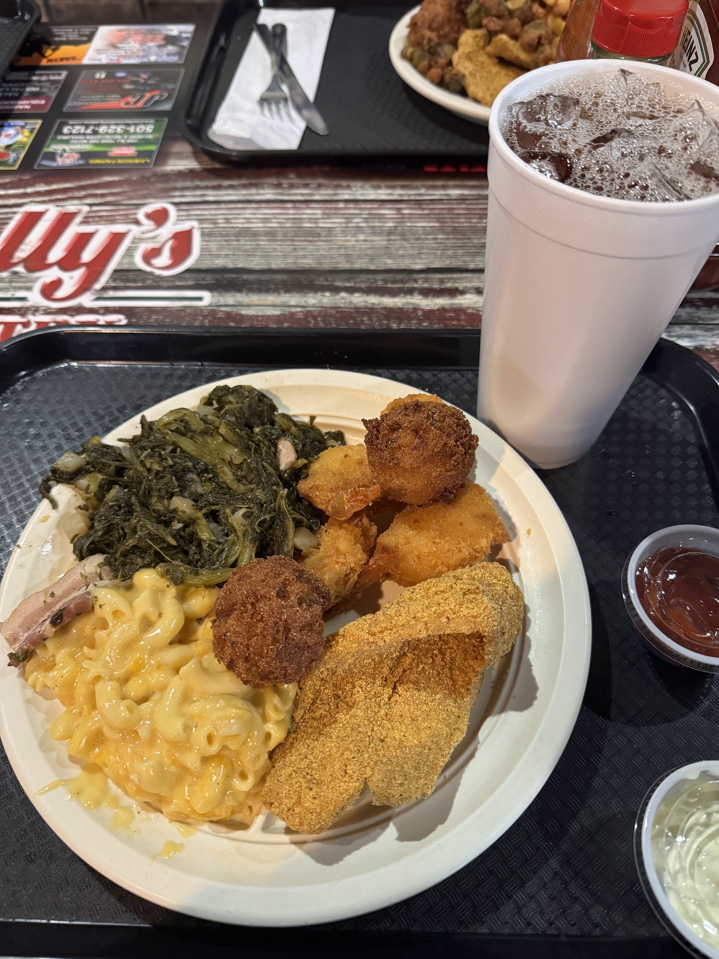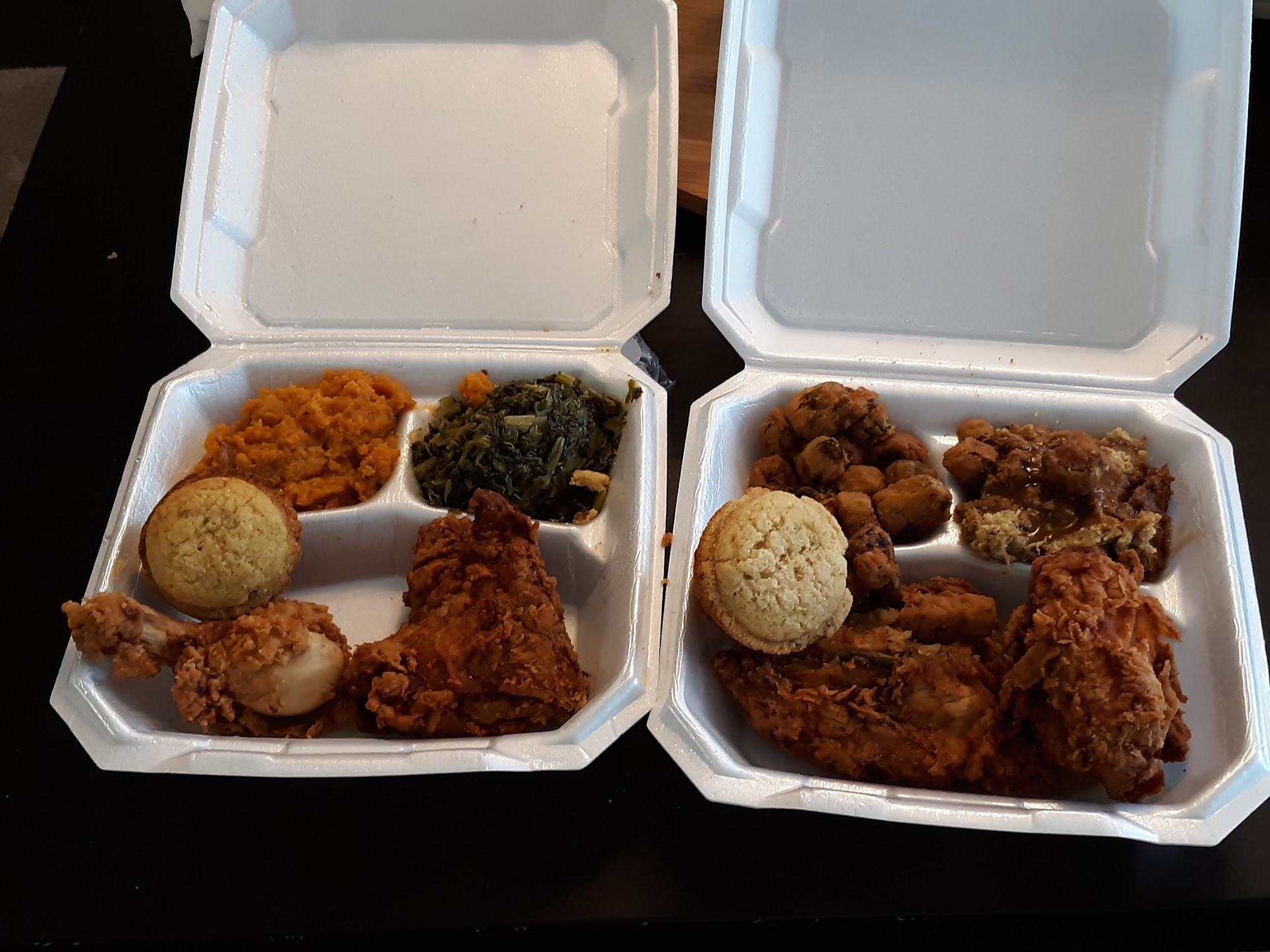 I was looking for a nearby chicken joint and this popped up on Google . I have to admit I was a bit confused when I walked into the place. I didn't see anything indicating how or where to go to order your food. I eventually saw a line start to form so I jumped in. I didn't see anything indicating the menu. It turns out you just go up to the counter when it's your turn to choose a meat and start pointing up the sides you want. Maybe because it was my first time there it felt hind up intimidating. I felt like I was in a Seinfeld episode," no soup for you". As for the food, I ordered 2 fried chicken dinners with various sides. The sides were pretty good, we had sweet potato, fried okra, collards and cornbread dressing with brown gravy. My favorite was the jalapeno cornbread. However the chicken was overcooked and dry. I so much wanted to like this place because the ladies there was...