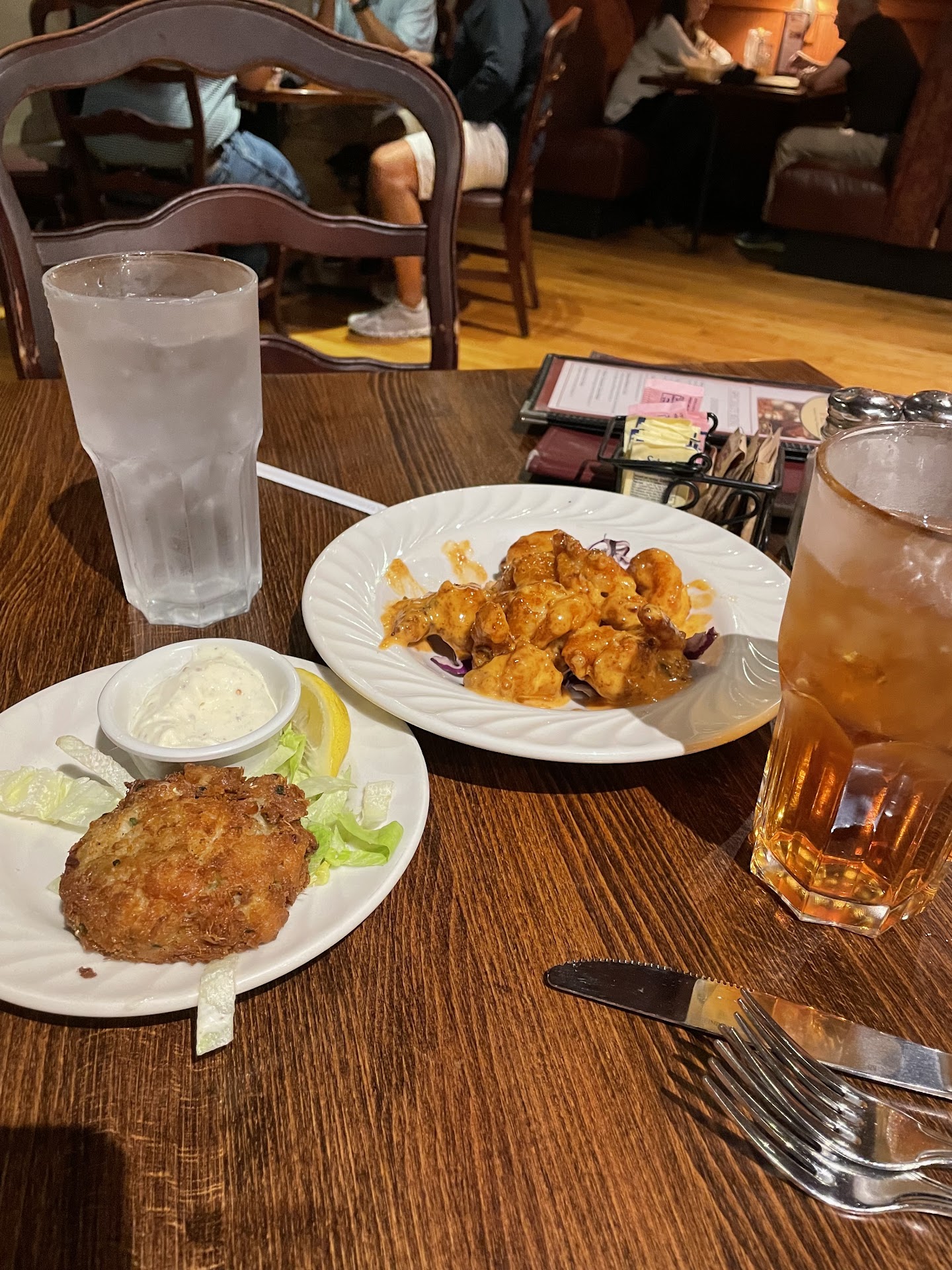We ordered a crab cake and bam bam shrimp as appetizers. They were tasty. Iâd eat them again.