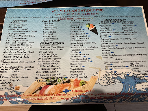 First the basics; the dinner all-you-can-eat for one adult is $30. There are some premium options that will add a $5 charge each (sashimi, steak hibachi, and salmon hibachi) Everyone at the table must either get the AYCE option OR order ala cart off the menu, you cannot mix ordering types at the table. You are given two hours to place as many orders off the AYCE menu as youâd like, but you are charged for any excessive uneaten food, or any uneaten sushi at all. This is a standard practice at all you can eat restaurants but may catch a newcomer by surprise!