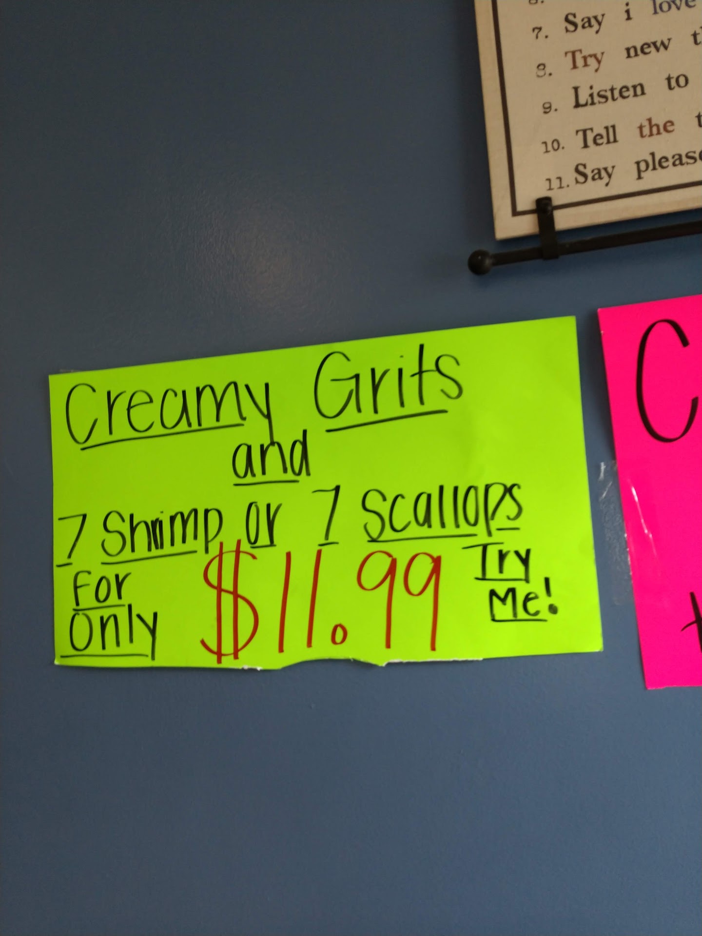Read moreWent to try it out. Guess I'm spoiled from living on the Alabama Gulf Coast. The fried green tomatoes were superb! I really liked the slaw. The grilled baby shrimp were not to my liking...drowned in some kind of overly-salty, butter. Hush puppies were ok and were served ice cold. Our server was inattentive and rude. No knives on the table, only forks. She served our very hot, delicious fried green tomatoes with no plates. I had to ask for plates and knives. Got a rude response from her. The younger server was a delightful young lady who was sweet, friendly and accommodating. SHE is an asset to the establishment...not the server we had. My husband got the fried flounder with fries. Said it was OK. Doubt that...
